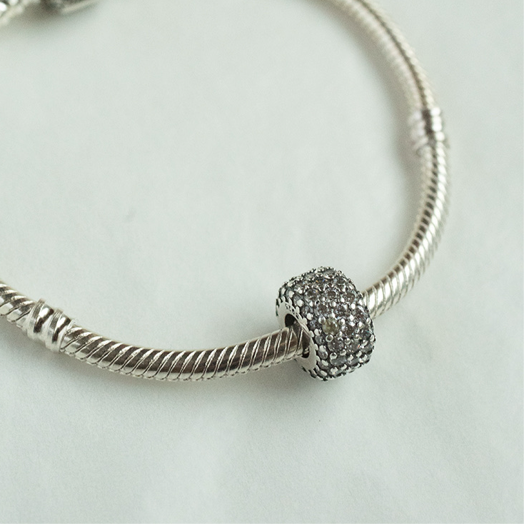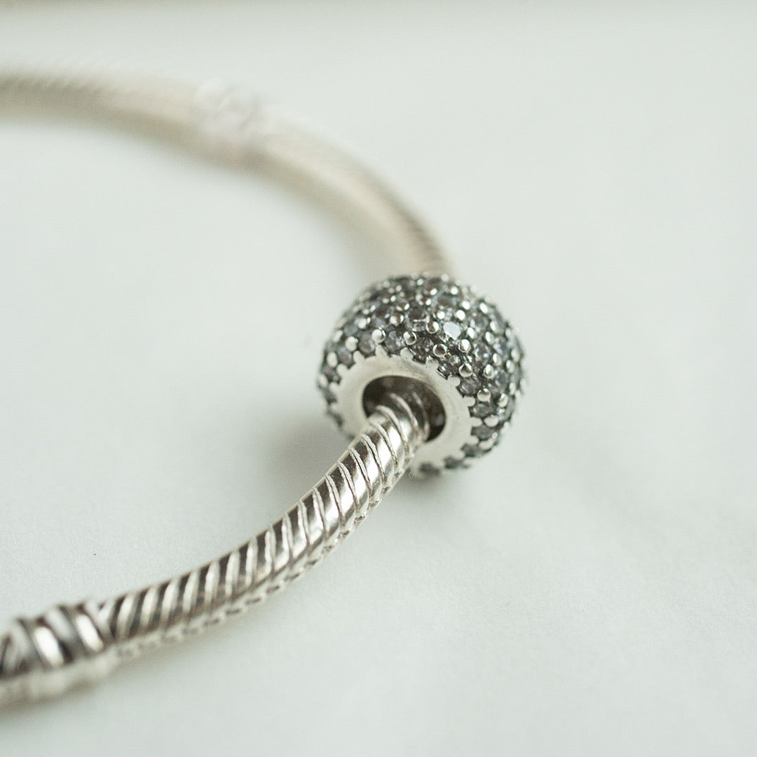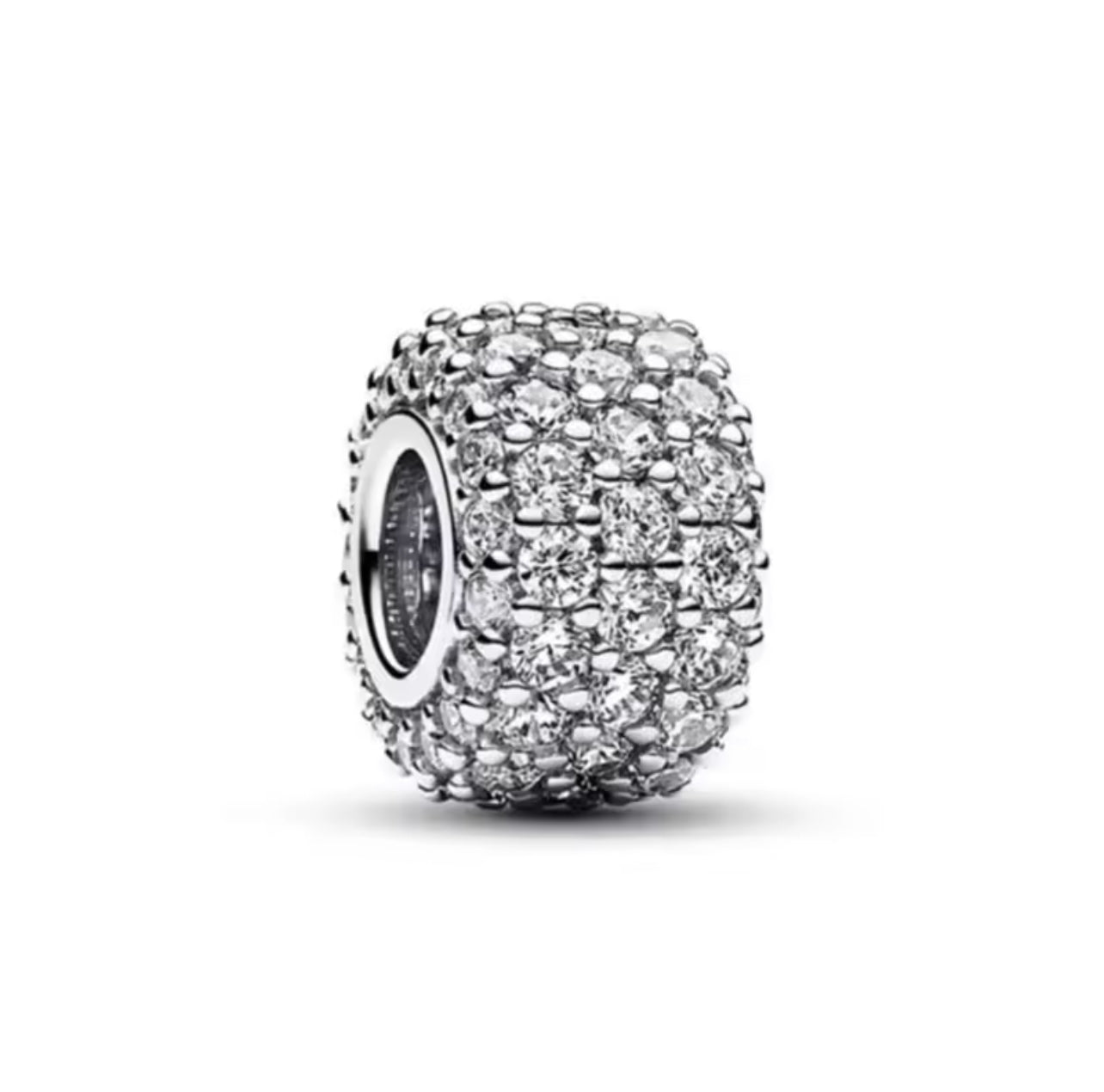 Enhance your charm collection with the dazzling Aion Charm. Crafted from 925 sterling silver, this charm is adorned with an array of sparkling cubic zirconia stones, creating a brilliant, eye-catching piece. Its beautifully textured surface reflects light from every angle, adding a touch of glamour to any bracelet.