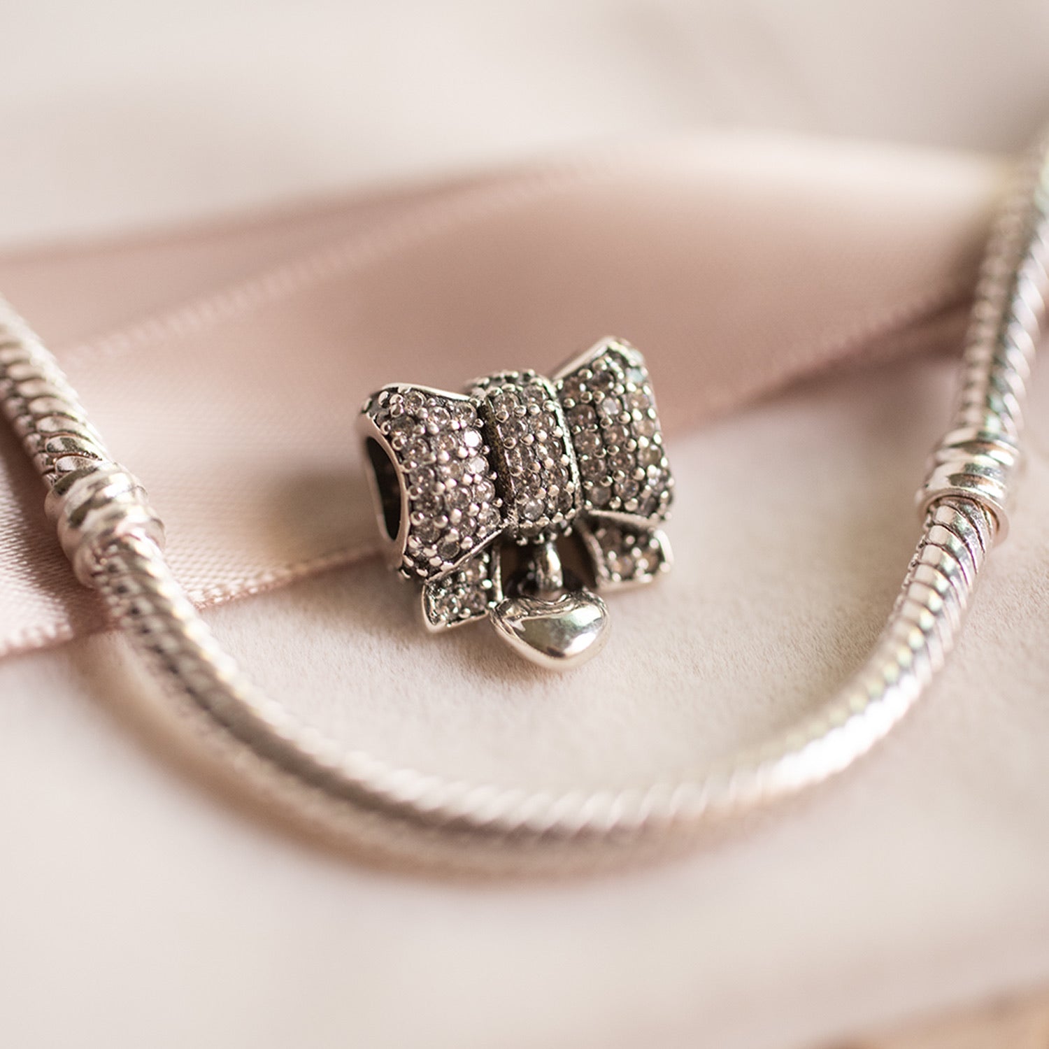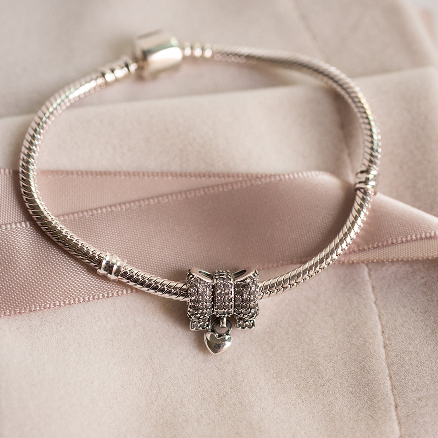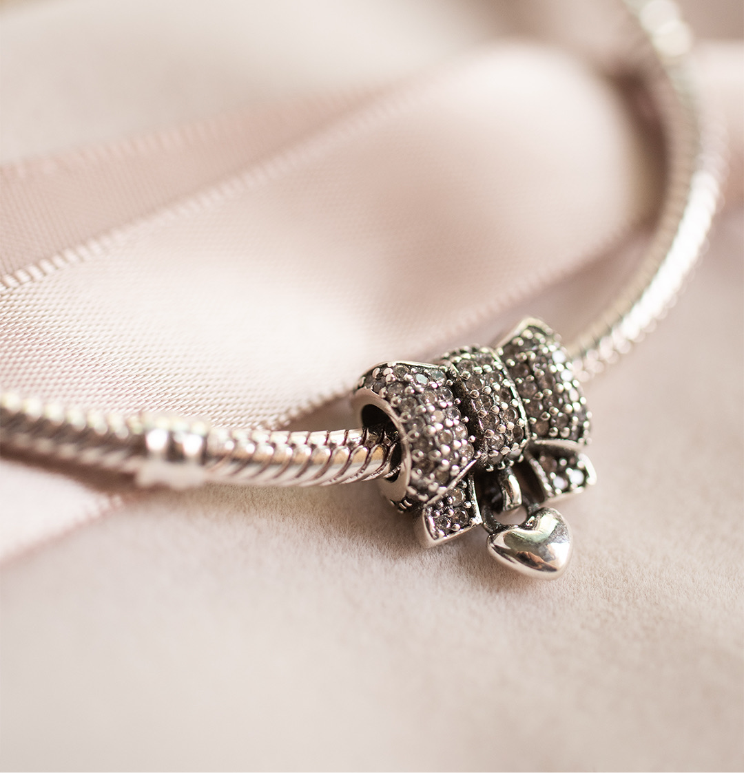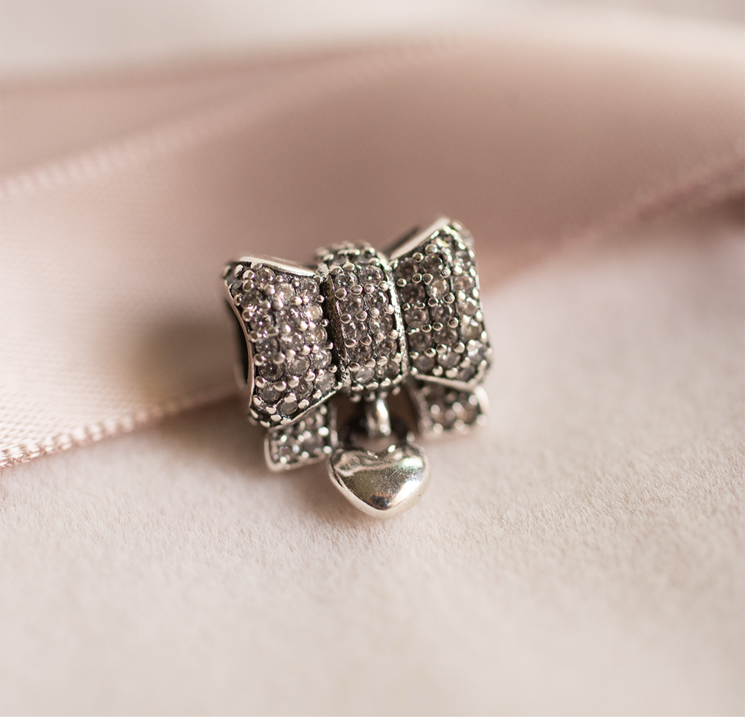 The Camille Charm adds a touch of playful elegance to your collection. Shaped as a delicate bow, this charm is embellished with pavé-set cubic zirconia stones, bringing a refined sparkle to its graceful design. A dainty heart dangle enhances the charm, symbolizing love and tenderness. Crafted in 925 sterling silver, Camille is perfect for those looking to infuse their charm bracelet with a hint of whimsy and sophistication.