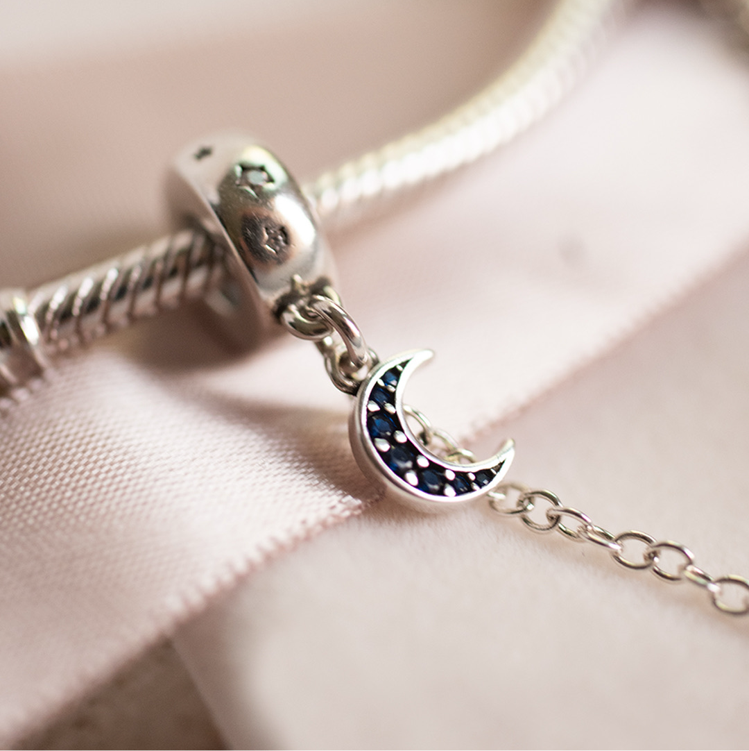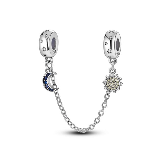 Embrace the harmony of night and day with the Celeste Safety Chain. This celestial-inspired piece features a delicate sterling silver chain connecting two stoppers adorned with the moon and sun. The moon sparkles with deep blue cubic zirconia stones, while the sun radiates with warm, golden hues. Designed not just for its beauty but for its function, this safety chain ensures that your charms remain secure while adding an ethereal touch to your bracelet.