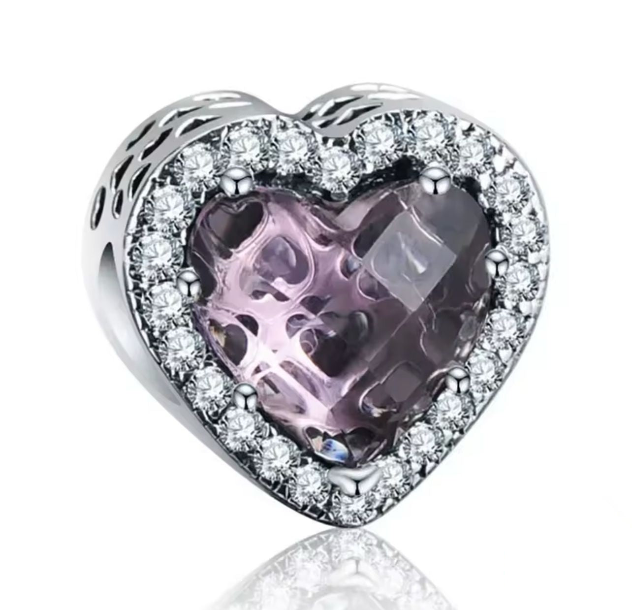 A radiant ode to celestial beauty, the Elara Charm captivates with its heart-shaped silhouette and mesmerizing lavender core. Encased in a brilliant halo of cubic zirconia, this charm reflects light like a constellation, adding refined sparkle to any bracelet. Whether gifted or self-chosen, Elara is an emblem of elegance and luminous affection.