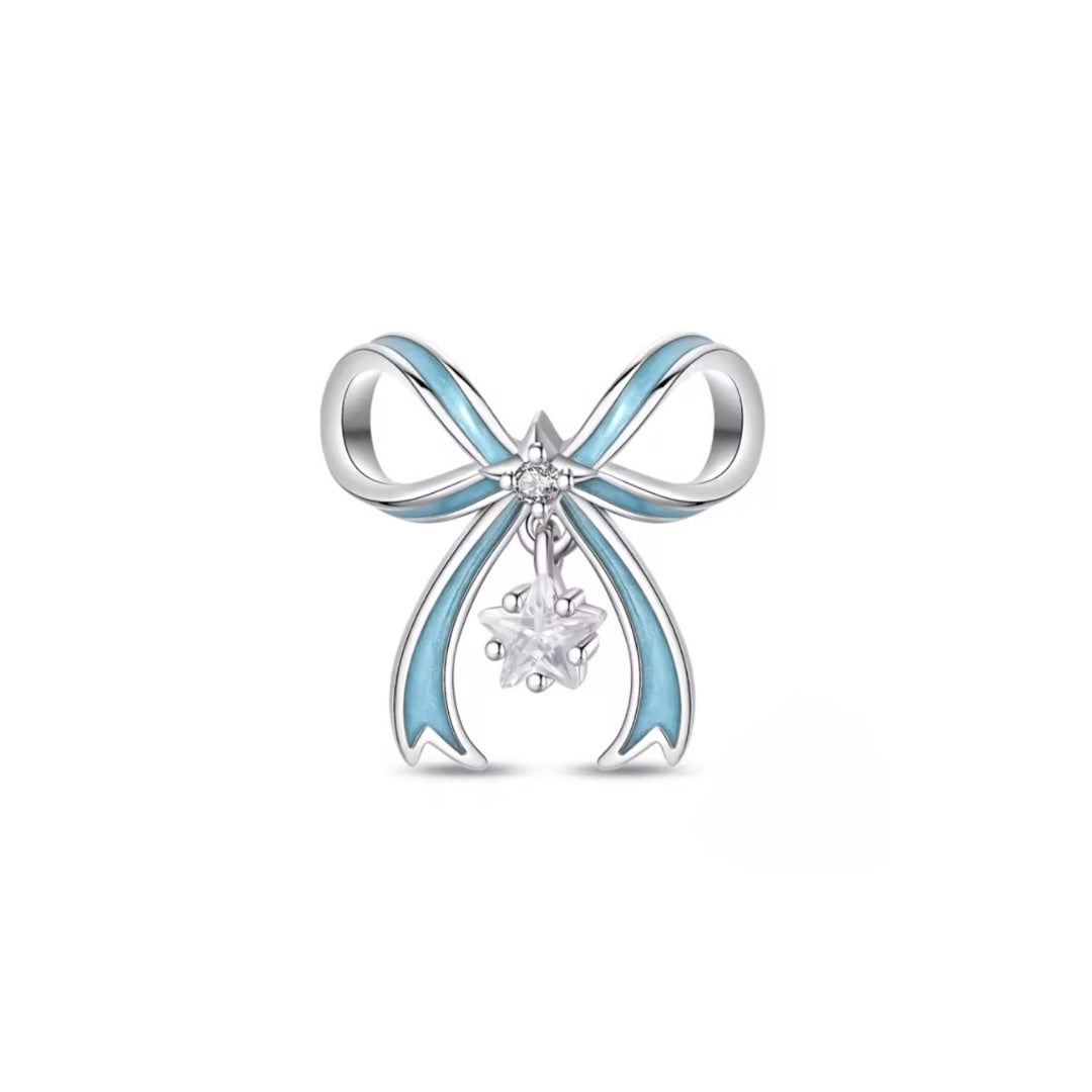 The Eve Charm is a delicate bow crafted from fine 925 sterling silver, detailed with soft blue enamel that glows like moonlight. At its heart, a radiant crystal star dangles gently — catching light, movement, and every gaze. It’s playful and poised, like a secret you carry on your wrist.