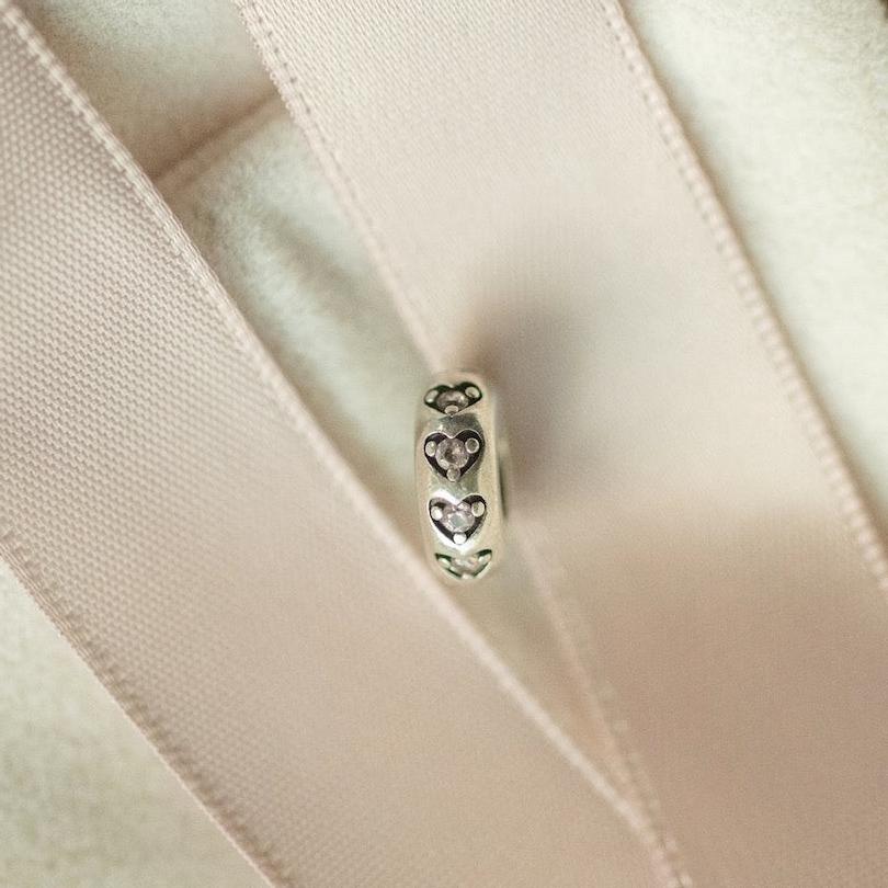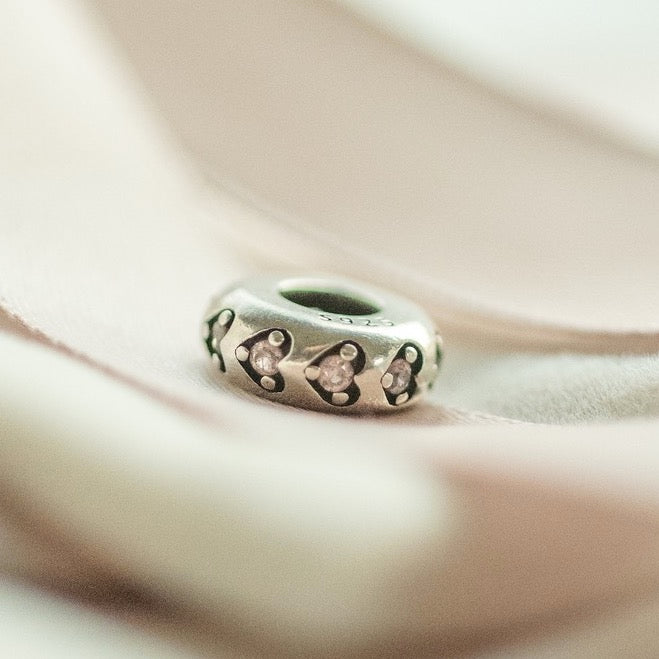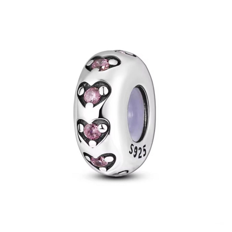 Add a touch of romantic elegance to your collection with the Iris Charm. Crafted in gleaming 925 Sterling Silver, this beautiful spacer features delicate heart-shaped cutouts, each adorned with sparkling pink cubic zirconia stones. The soft, feminine design effortlessly combines timeless style with a modern touch, making it the perfect accent for your bracelet.