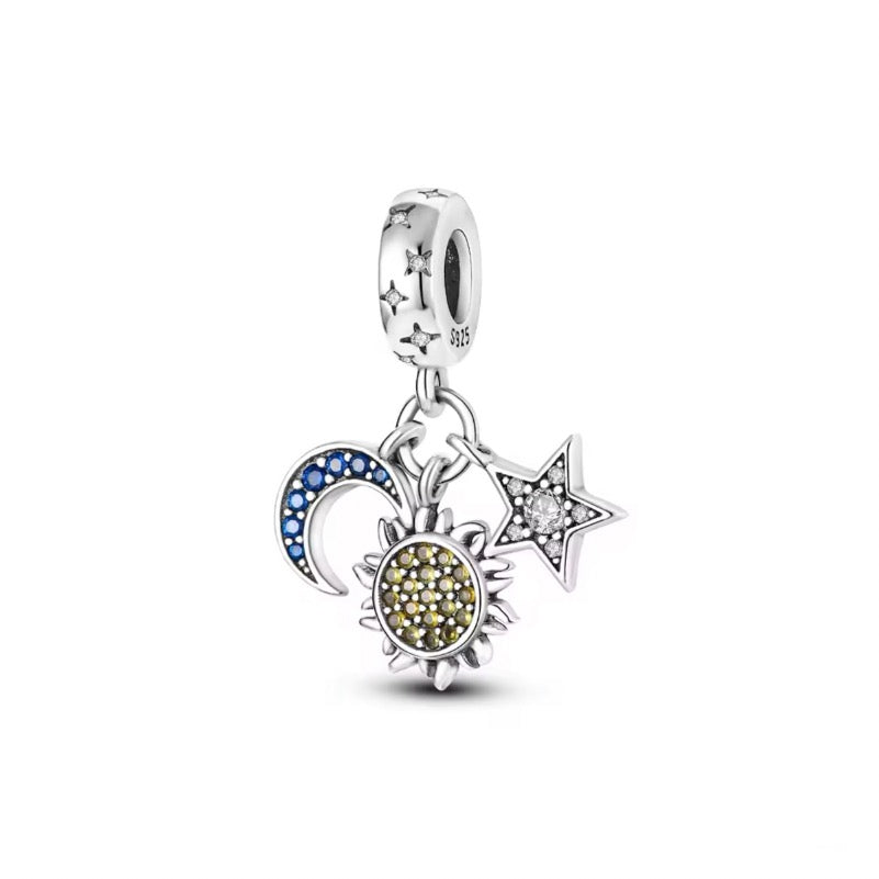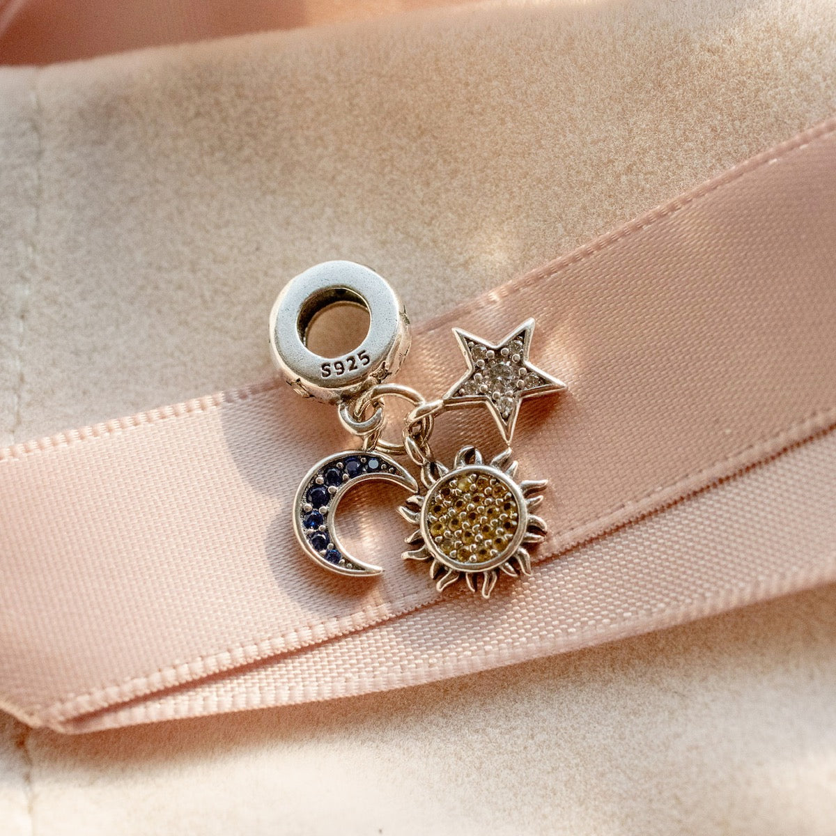 Celebrate the magic of the cosmos with the Noelle Charm, a radiant trio of celestial symbols. Crafted in 925 Sterling Silver, this charm features a twinkling star, a crescent moon accented with deep blue cubic zirconia, and a golden sun adorned with warm, shimmering stones. Together, they bring a harmonious balance of light and wonder to your bracelet.