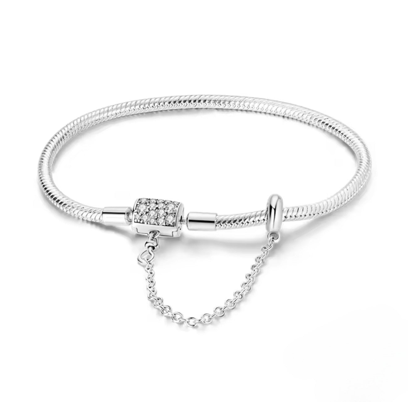 The Ravenna Bracelet blends form and function in flawless harmony. Crafted from pure 925 sterling silver, its sleek snake chain holds a pave-set clasp that glitters with hand-set cubic zirconia. But what sets Ravenna apart is the elegant safety chain — both a visual detail and a graceful guard, designed to keep your treasured charms secure.