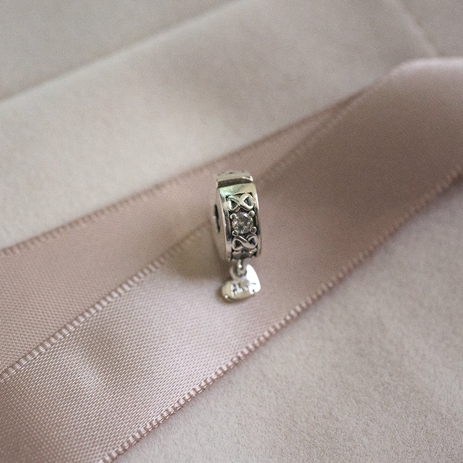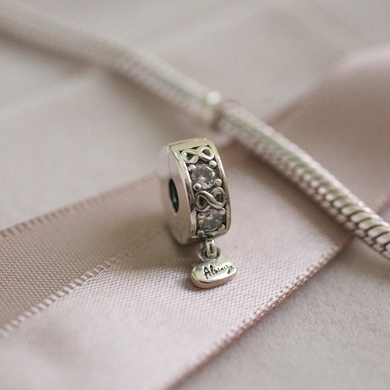 Celebrate eternal love and commitment with the elegant Rhea Charm. Crafted from 925 sterling silver, this charm features intricate infinity symbols and sparkling cubic zirconia stones, symbolizing endless love and connection. The charm is beautifully accented with a dangling heart inscribed with the word “Always,” adding a sentimental touch to your bracelet.